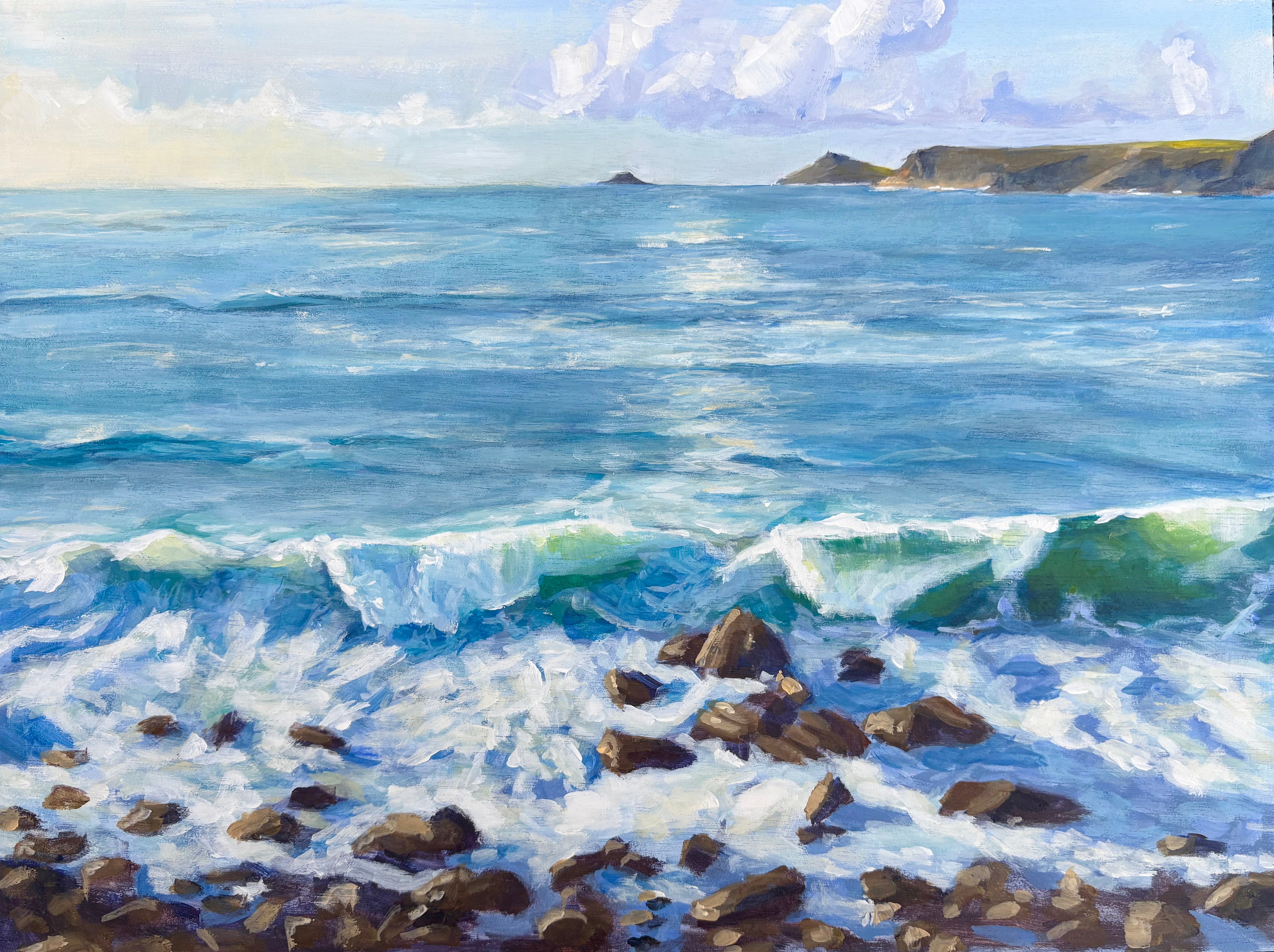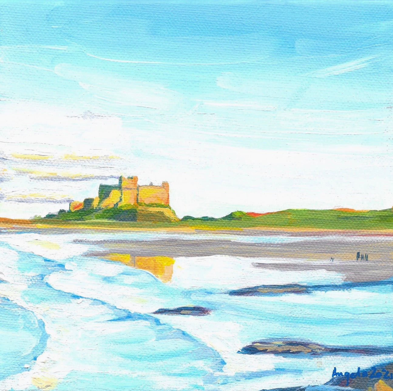 Angela’s art has been inspired by her travels, whether it be the dramatic skies of the Outer Hebrides to the turquoise seas of Cornwall or from red desert rocks, to tropical sunsets.