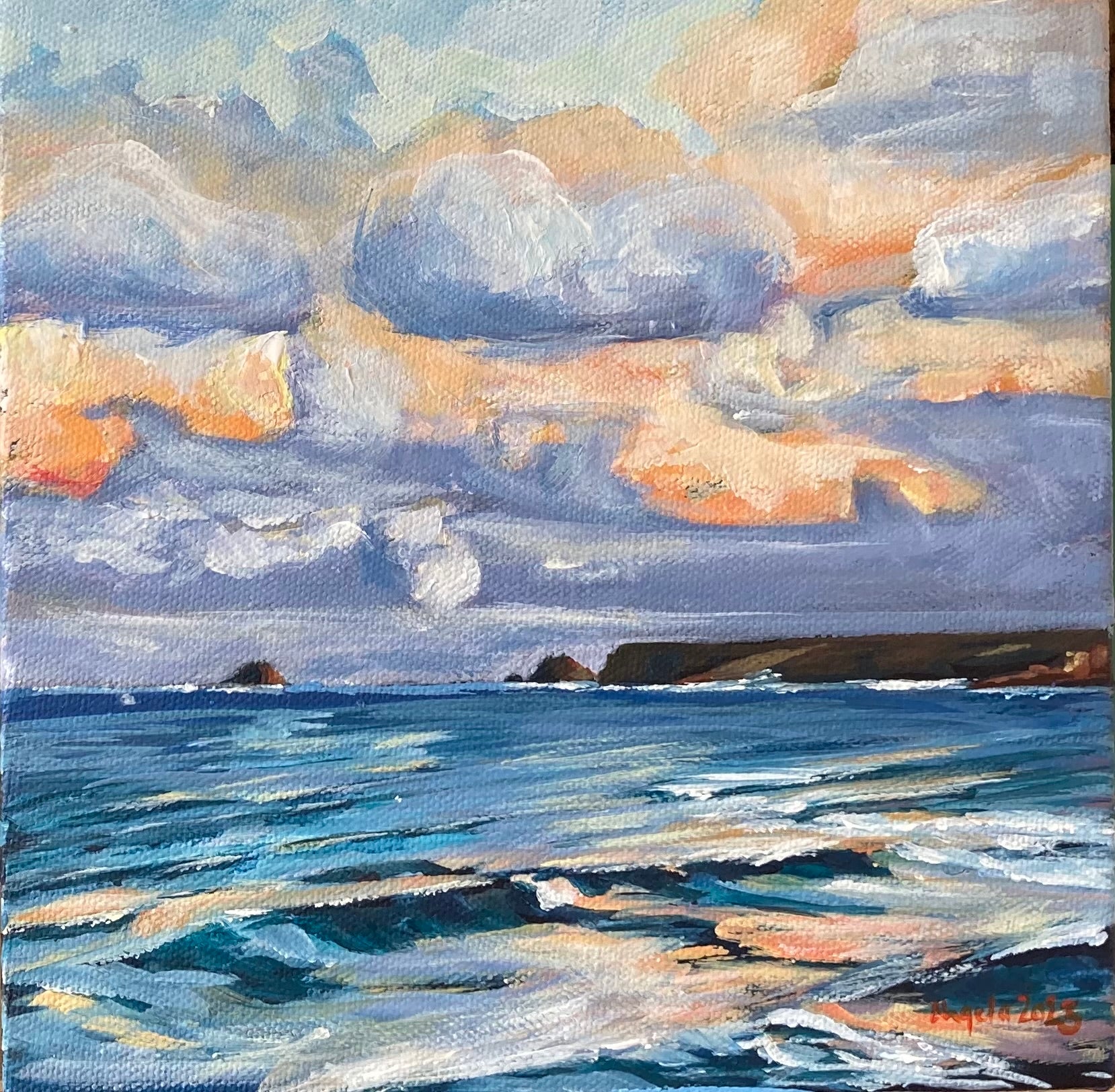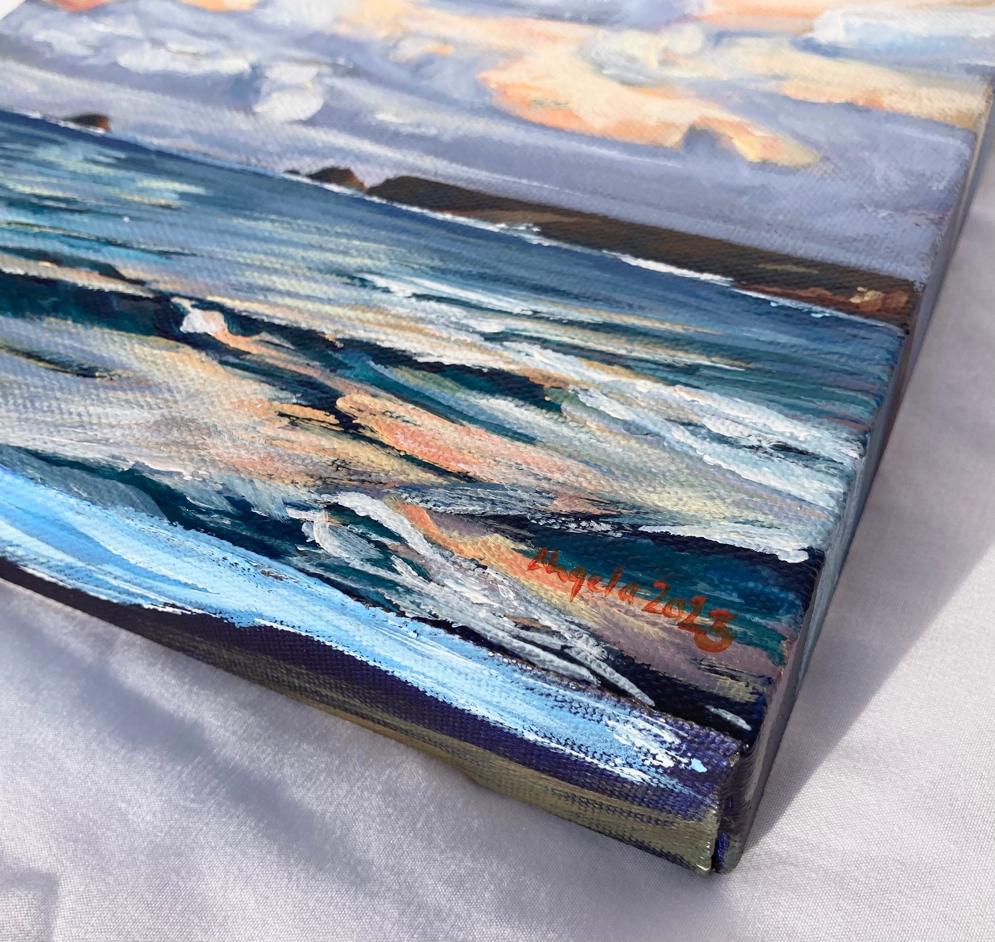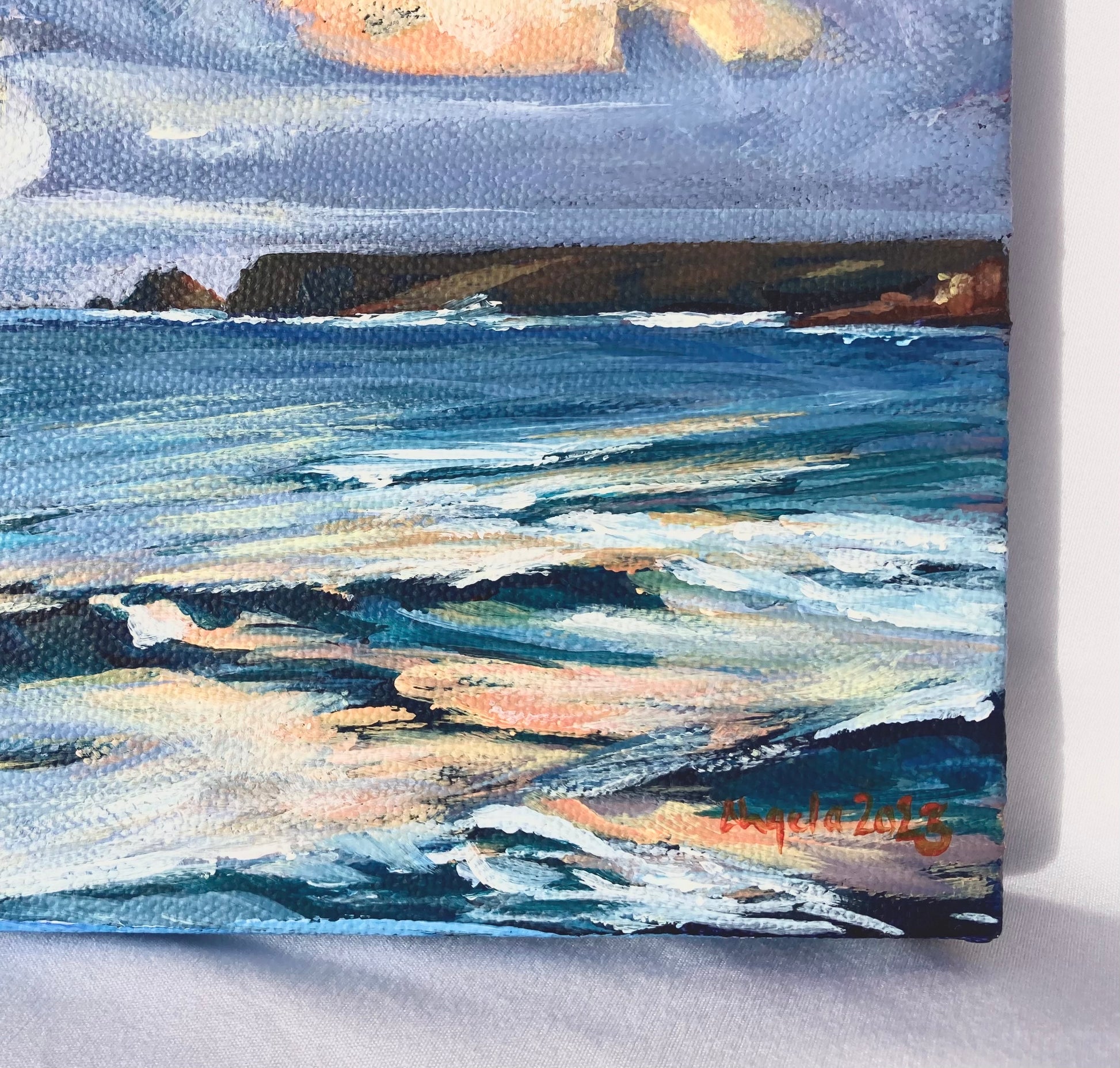 This original piece of art work, is off Cape Cornwall as seen from Sennen Cove. With the sun setting, the clouds have hints of orange and peach that are in contrast with the darkness falling over the land. The light of the sky is reflected in the sea below and catches on the waves which are crashing onto the beach in their own rhythmic and soothing way.