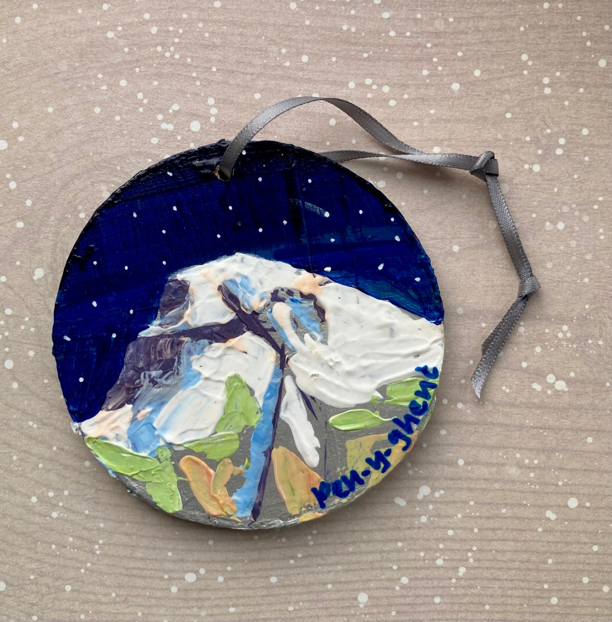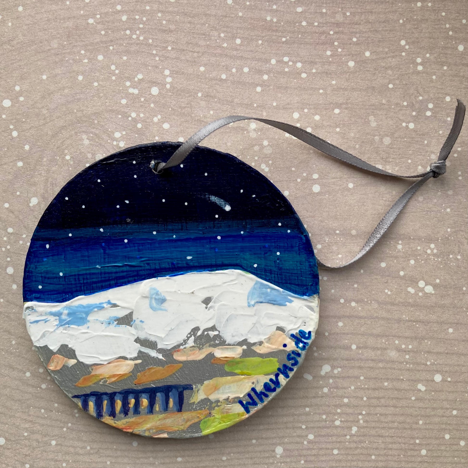 A set of three baubles of the 3 peaks in Yorkshire. Ingleborough, Pen-Y-Ghent and Whernside. Hand painted on wooden baubles approx 10 cm in diameter, sealed and with a silver ribbon tie. Same image on both sides.